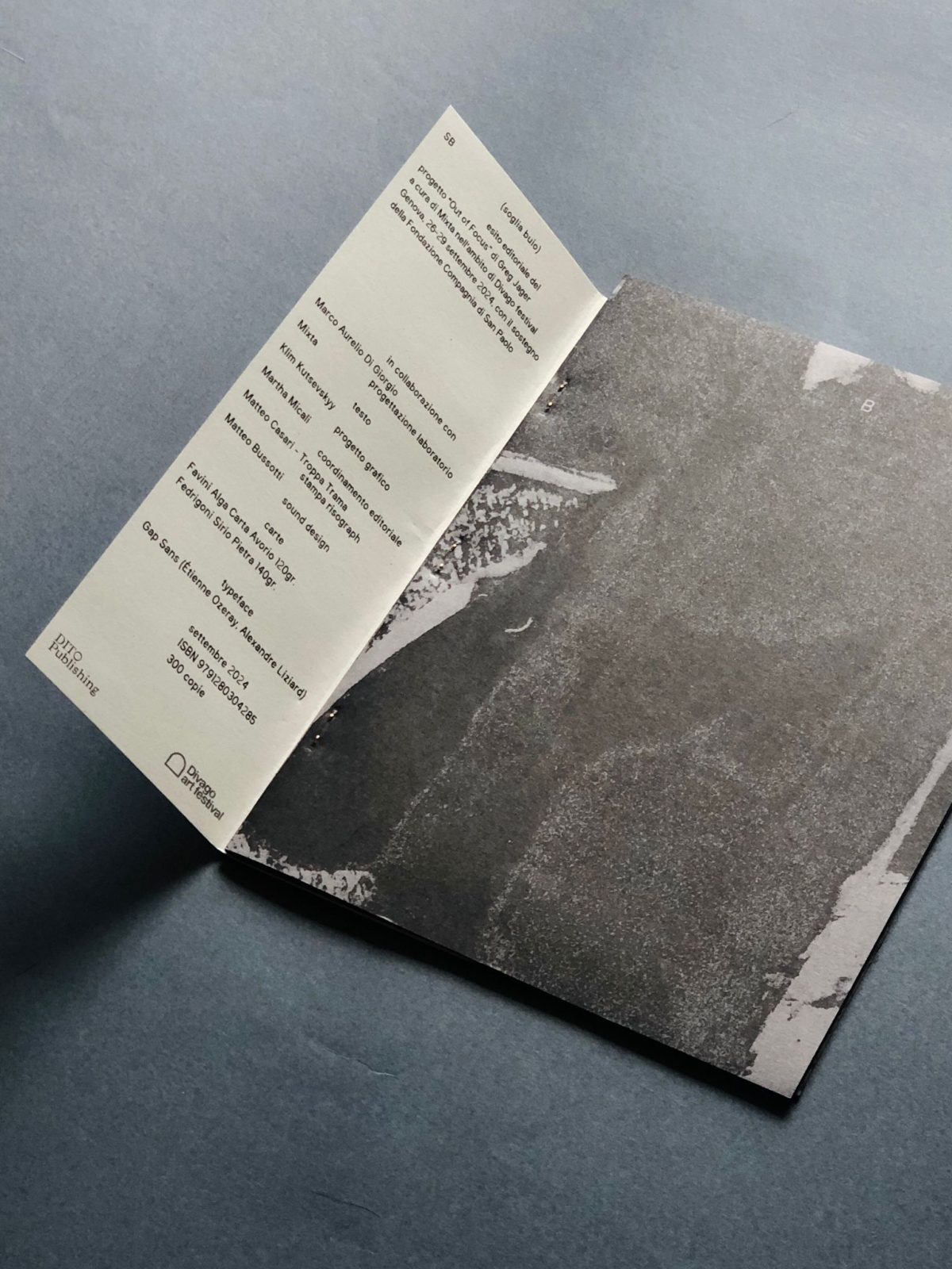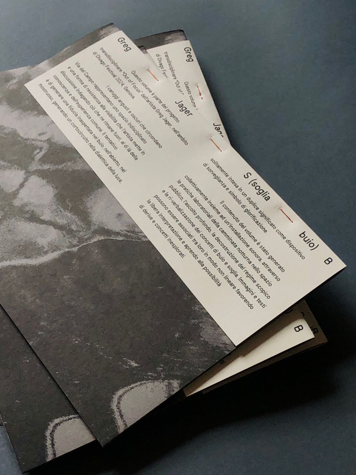 SB (soglia buio) is the editorial outcome of the Out of Focus workshop conducted during the Divago Festival 2024 residency in Genoa. Published by DITO Publishing, the volume was presented as part of the festival’s transient bookstore. The project translates the experiential and philosophical inquiries of the workshop into a tangible, material form, exploring the duality of threshold and darkness, concepts central to the research started with Nigredo and further developed during Out of Focus.